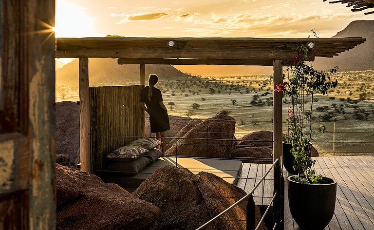 After our visit, we continue inland toward Damaraland, where the landscape transitions from stark coastal plains to rugged mountains, dry riverbeds, and vast open spaces shaped by ancient geological forces. Along the way we enjoy impressive desert scenery before arriving at Camp Kipwe in the late afternoon. Built among clusters of massive granite boulders, the camp blends seamlessly into its surroundings and offers a truly atmospheric base for exploring this ancient region.