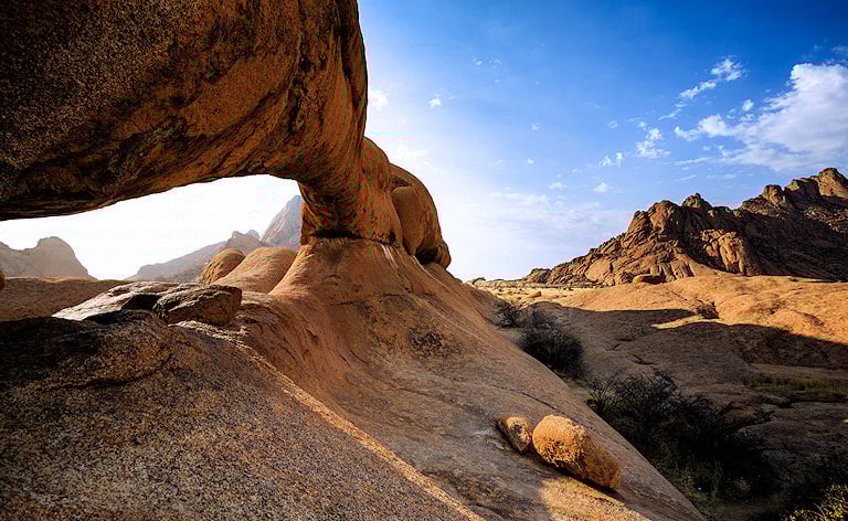 Later, we explore other highlights of the region, which may include the Organ Pipes basalt formations, the color-shifting slopes of Burnt Mountain, or a scenic drive through the Aba Huab River valley in search of desert-adapted elephants. These elephants have developed unique behaviors that allow them to survive in extremely arid conditions, often walking long distances between ephemeral water sources. We return to Camp Kipwe in the late afternoon, where the warm granite boulders glow beautifully in the setting sun.